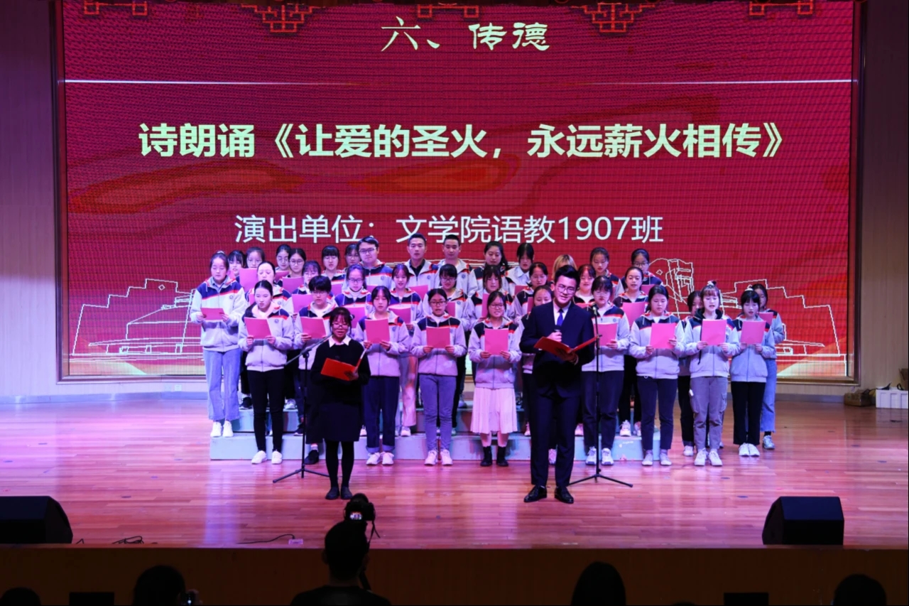 最后在“传德”环节,语文教育1907班同学带来的诗朗诵《让爱的圣火,永远薪火相传》中圆满结束此次道德讲堂。