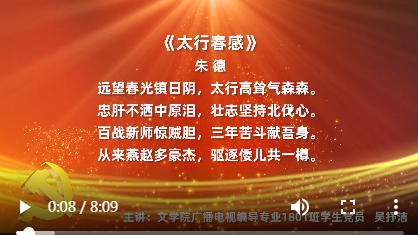 日前,经过多日筹划的第一期微党课上线。为深入开展党史学习教育,把学习教育与专业相结合,伟德国际1946bv官网党总支策划了系列讲党史故事、赏红色诗词活动。学生一、二党支部首批组织了5名优秀学生党员,来赏析5篇革命诗词。这里发布的是吴抒洁同学赏析《太行春感》(朱德)()。