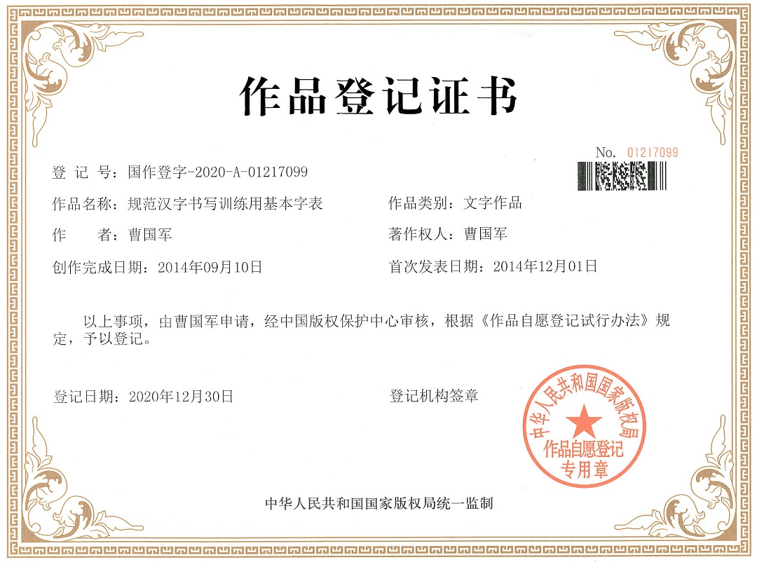 如果有人告诉你,只要扎扎实实练好300多个汉字,常用汉字就可以轻轻松松写好,你肯定觉得难以置信,但伟德国际1946bv官网曹国军教授倾心研制的“规范汉字书写训练用基本字表”可以帮助每一个想练好字的人将此变成现实。日前,该成果通过中国版权保护中心审核,由国家版权局予以登记。