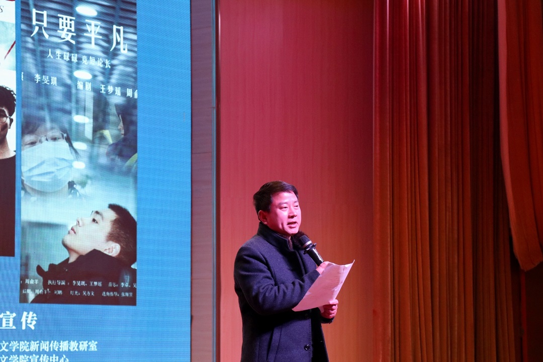 最后放映的短片《只要平凡》以2020年疫情为背景,讲述了自主创业的大学生在时代的漩涡中挣扎的故事。曾经满怀壮志的主人公,因为突如其来的疫情,陷入了资金断裂、合伙人离开、人生不知何去何从的困境。此片除了创业失败的经历,也融入了亲情的温暖,为凄凉的故事增添了一抹暖色。饶军教授认为这是一部能够引起大多数观众共鸣的影片,但在拍摄技术上存在着一些不足,他提出了改进的意见,剧组成员受益匪浅。