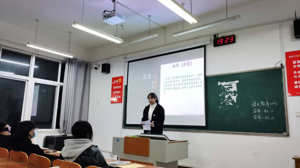 第一位做分享的是皮思雨同学,她向大家推荐了余华的《活着》,并汇报了自己的阅读心得:一个故事一个人生,轻描淡写的背后有多少不为人知的心酸与悲凉。人活一世,坎坷数之不尽,若是任何一点波澜便能影响我们活着的信念,那早已万劫不复。福贵如今可以轻松地说出故事,就是因为他有活着的意志,活着的精神。