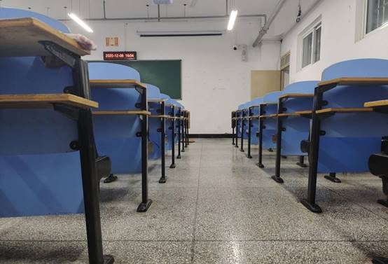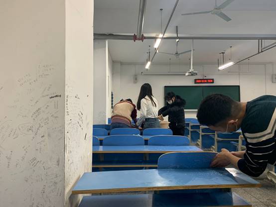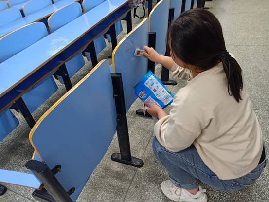 除了地面清扫,桌椅表面和墙面的涂鸦也是此次清洁的重点,为了将卫生彻底打扫干净,学生会干部们自费购买了洗衣粉、钢丝球等清洁工具。学生会主席周斌带领大家用刷子和洗衣粉仔细地处理桌面、椅背上的涂鸦污渍痕迹,并现场对清除方式做出示范,大家有条不紊、一丝不苟地对每间教室、每套桌椅上的痕迹进行逐一清洁,让教室的面貌焕然一新。