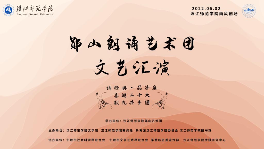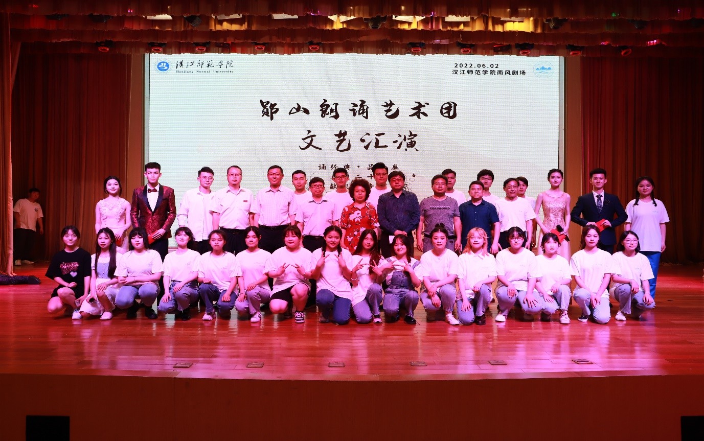 本次“郧山朗诵艺术团”圆满结束。汇演以“诵经典,品清廉,喜迎二十大,献礼共青团”为主题,传颂经典,传扬清廉,紧跟时代,团结青年, 切实遵循了服务地方的办学理念,充分发挥了师范院校的文化优势,展现了汉师办学特色。