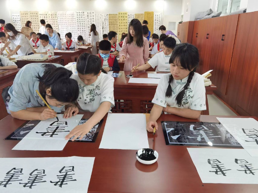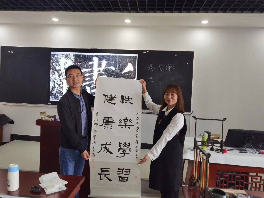 据了解,人民小学的办学理念是“快乐学习,健康成长”。活动结束时,王刘涛老师将以此为内容的隶书作品赠送给该校。