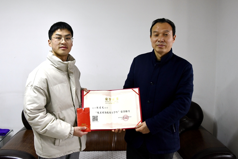 2月14日,受党委书记杨鲜兰、校长付永昌委托,党委副书记周明华一行来到竹山县城关镇陈星天同学家中对他表示慰问,为其颁发“见义勇为优秀大学生”荣誉证书及2000元慰问金,对他奋不顾身勇救落水者的英勇事迹进行表彰。