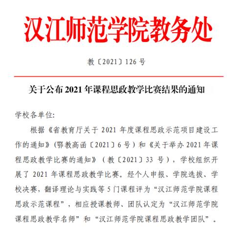 根据《省教育厅关于 2021 年度课程思政示范项目建设工作的通知》(鄂教高函[2021]6号)和《关于举办 2021年课程思政教学比赛的通知》(教[2021]33 号),学校组织开展了 2021 年课程思政教学比赛。经个人申报、学院选拔、学校决赛,我院《古代文学》课程获伟德国际1946bv官网 2021 年课程思政示范课程,参赛教师杨真真个人获课程思政教学名师称号。