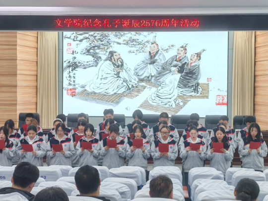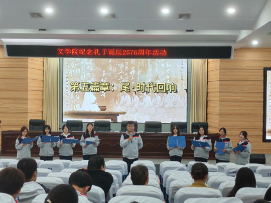 接下来各班级依次进行节目展示。第一个节目是由汉语言文学2503班带来的以《孔子·为政》为主题的朗诵。他们深刻诠释了孔子的德治思想与教育智慧。从“为政以德”到“温故知新”,节目融合孝道、治学、修身等内涵,声情并茂地展现了儒家文化的精髓,并彰显了的底蕴与风采。